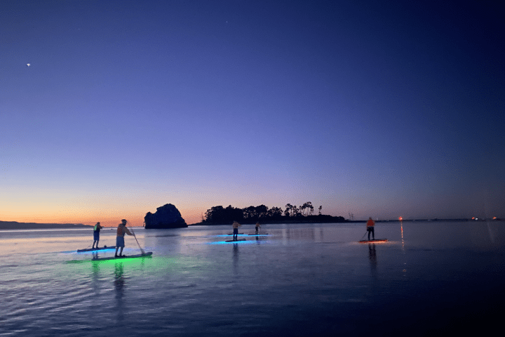 As darkness falls, we light up our boards and observe the moana (ocean) from a perspective very few will ever get the opportunity to do. Plus, it’s awesome seeing the lights glowing throughout the water as we glide past the waterfront of Nelson.